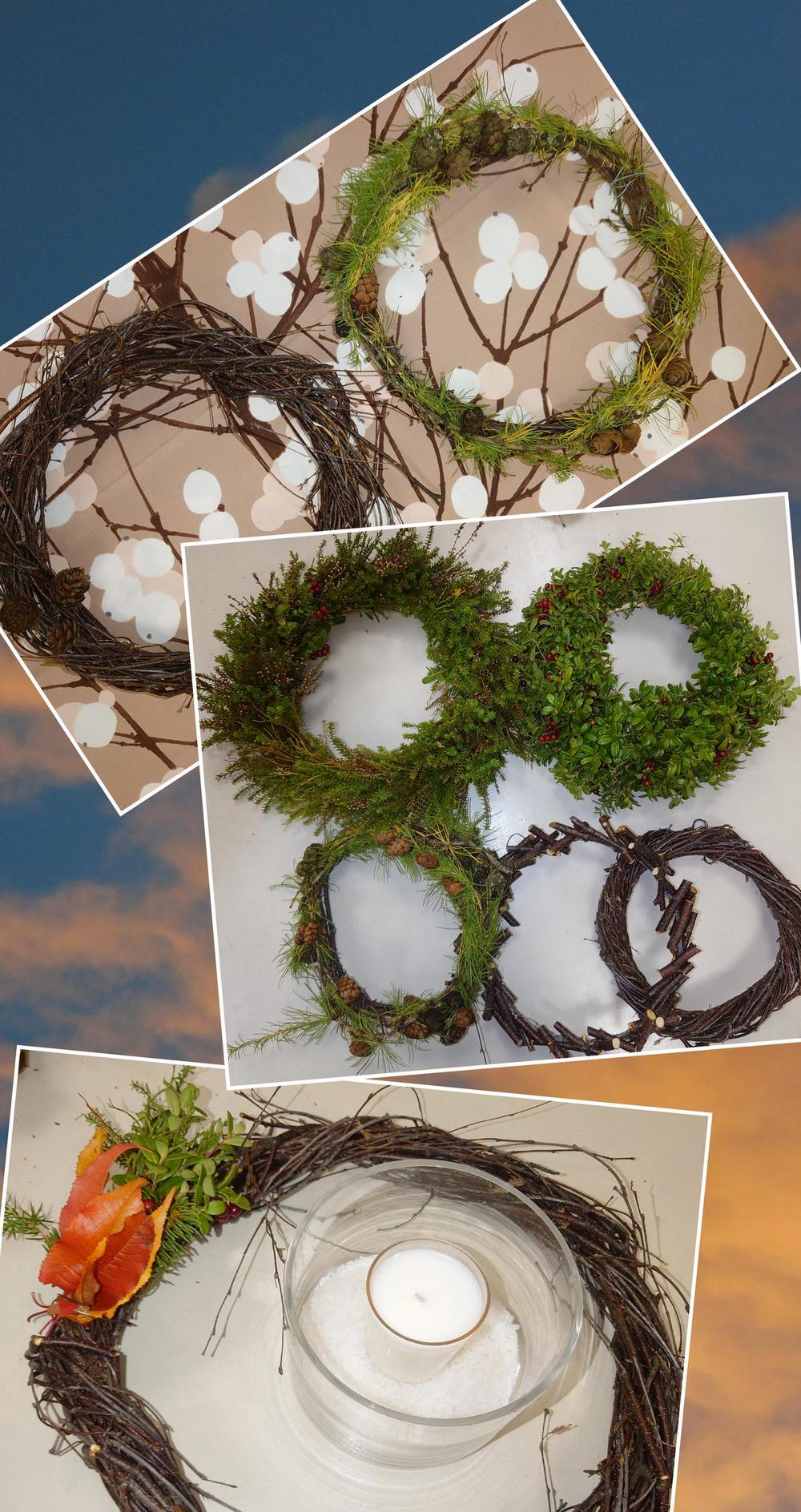 Teimme kransseja. Pohjana käytettiin koivunrisuja, puuvanteita, ja rautalankaa. Koivun oksat muotoituivat luoviksi kranssipohjiksi ja niihin taiteiltiin erilaisia syksyisiä koristeita: puolukan- ja mustikanvarvuista, kielon marjoista, kanervista ja värikkäistä lehdistä. Katso kuvat kuvagalleriasta.