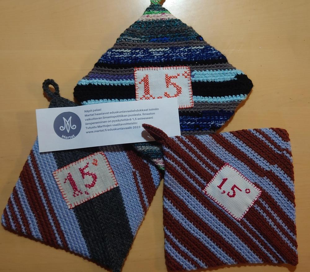 Ristipistoviestejä "1,5 astetta" syntyi illan aikana lupsakan puheensorinan saattelemana. Osa kirjonnoista ehdittiin jo kiinnittää pannulappuihin, mutta kotiikin jäi vielä tekemistä. Virkatun neliönmuotoisen pannulapun ohje löytyy martat.fi-sivuilta. Jalkaudumme oman aikataulun mukaan jakamaan ilmastopolitiikan terveiset alueen ehdokkaille.