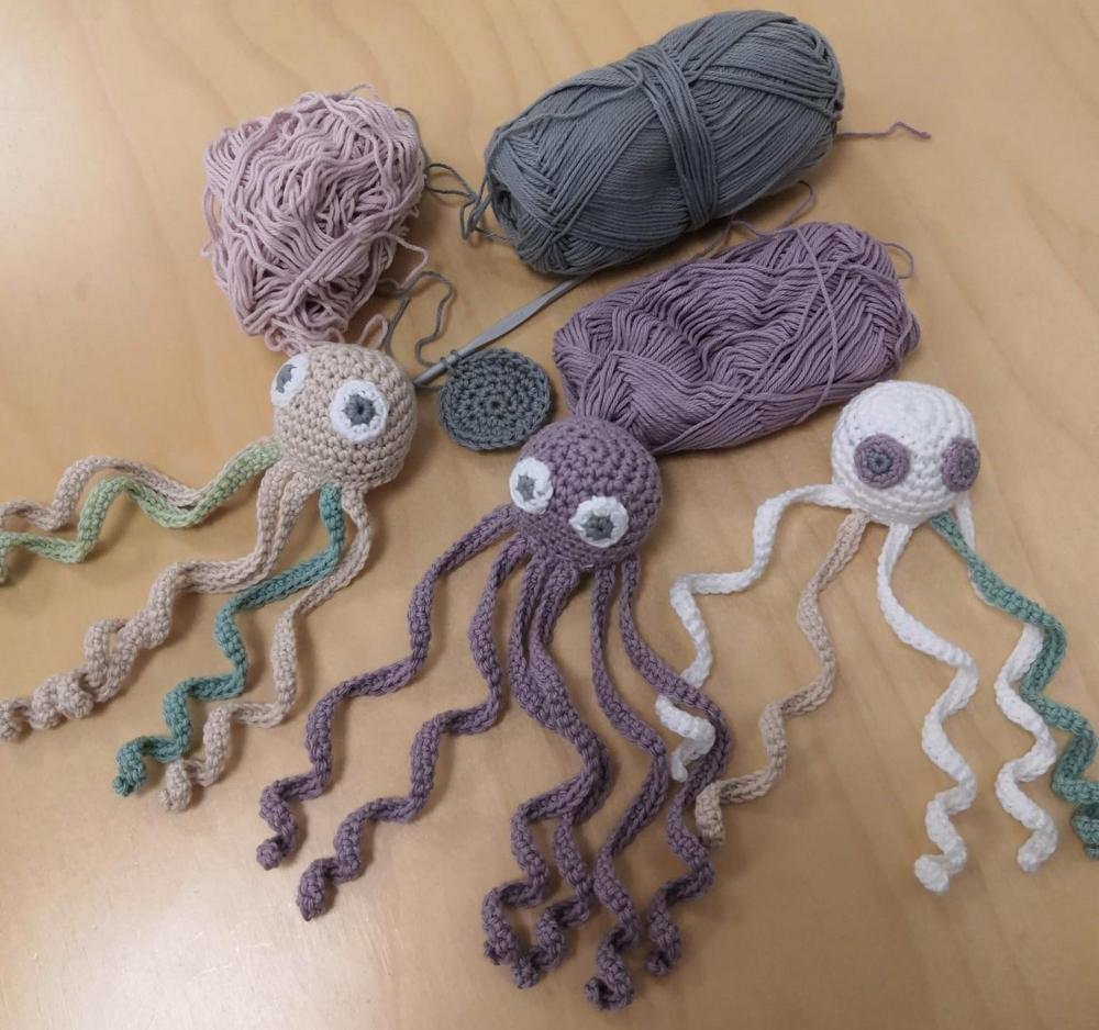 Turvalonkero mustekalan virkkaus, johon Tuula toi ohjeet ja langat. Turvalonkerot pitää valmistaa langasta, josta ei lähde karvoja tai nyppyjä, jotka joutuisivat vauvan suuhun. Sopivia ovat muun muassa puuvillalangat. Turvalonkeroiden tulisi kestää 60-asteen pesua. ks ohje tästä