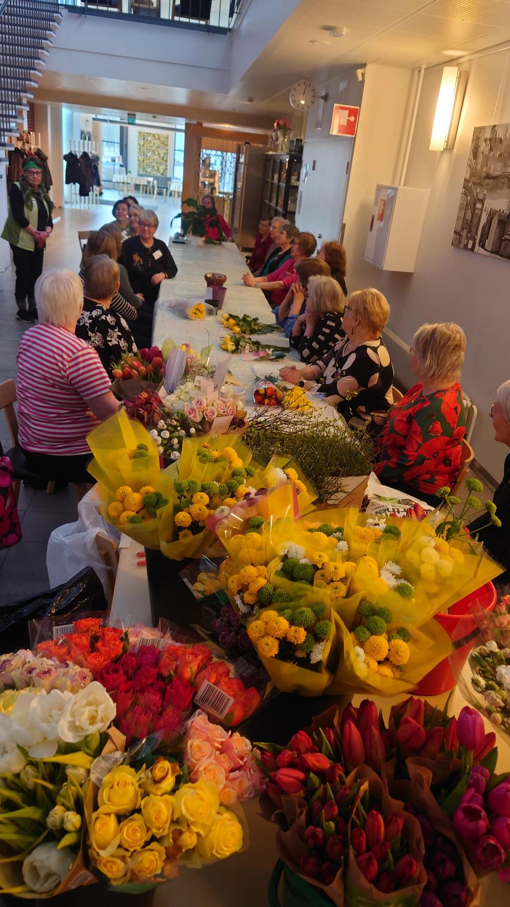 Suvi Repo ohjasi meille miten kukkakimpun sidonnassa käytetään spiraalitekniikka: ensin kaksi kukkaa ristiin ja sitten seuraavat varret samansuuntaisesti myötäpäivään edeten, varsien muodostaessa ilmavan spiraalin. Kun pitkät varret leikattiin, niin päästiin kokeilemaan pysyykö kimppu pystyssä spiraalin ansiosta. Kimppuihin materiaaleja olivat lahjoittaneet K-supermarket Joutsensilta ja Kaijonharju, K-Market Kuivasjärvi, CM Raksila ja Mäntylän Sale. Kiitokset heille. Illan aikana syntyi kauniita kimppuja tulppaaneista, ruusuista, neilikoista ja krysanteemeista. Luonnon materiaalit, koivun, pajun ja lehitkuusen oksat sekä varvut löysivät myös paikkansa kimpuistamme.