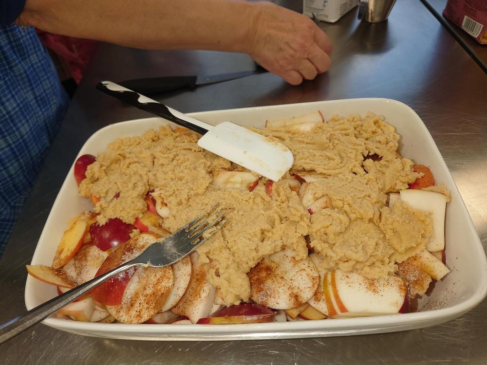 Omenapaistoksessa oli 100 g voita, 1 dl sokeria ja 2 dl vehnäjauhoja. Ne sekoitettiin murutaikinaksi. Vuokaan lohkottiin omenia ja kanelia kerroksittain ja murukansi päälle. 200 C n 40 min uunissa ja paistos oli valmis nautittavaksi jäätelön/vanilijakastikkeen kera.