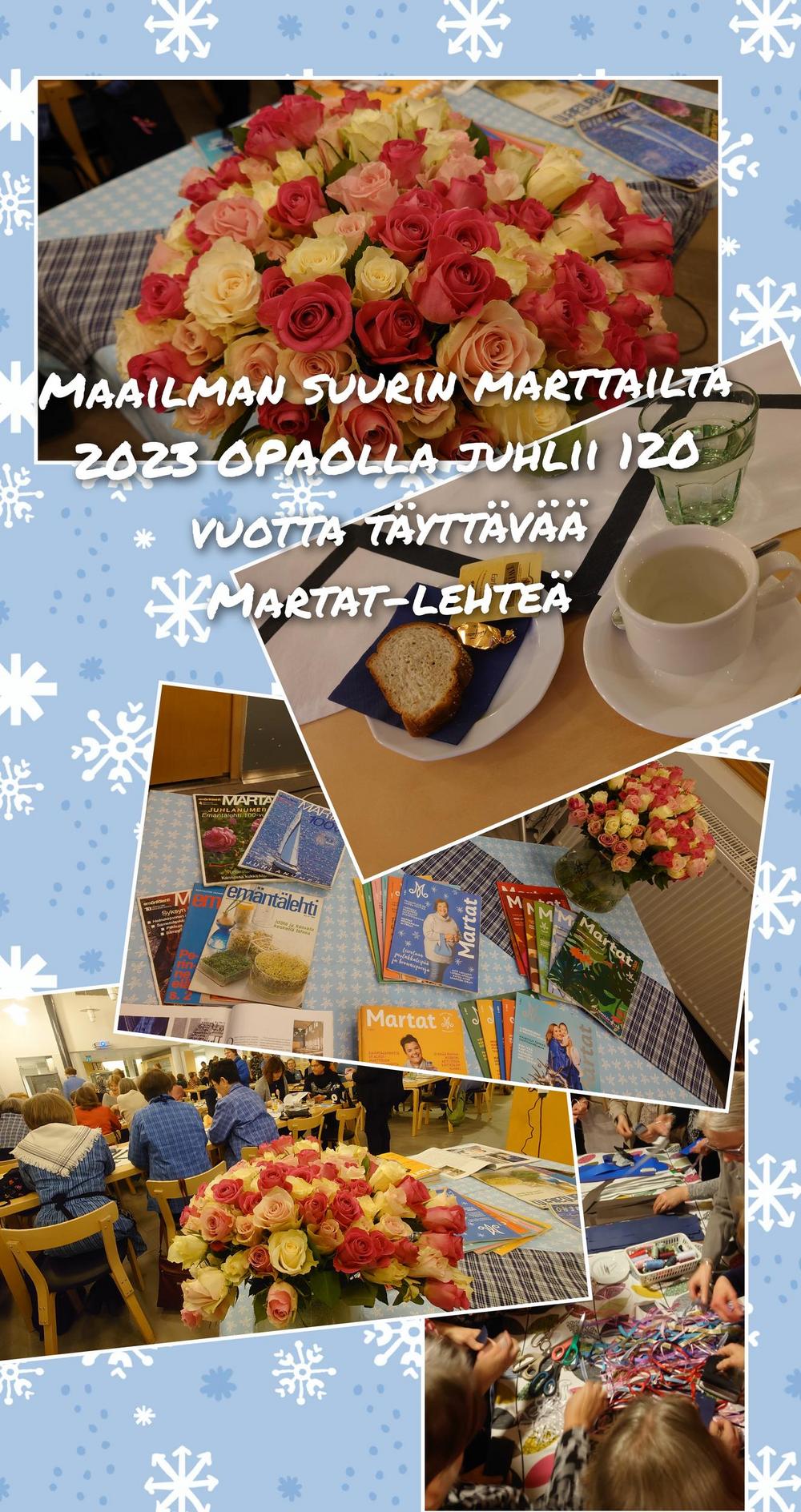 Maailman suurin martta -ilta juhli 120 -vuotta täyttävää Martat -lehteä. Juhla järjestettiin yhdessä useamman marttayhdistyksen kanssa OPAOlla. Kuulimme marttalehden historiasta ja haasteteltavana olleen toimittajan Elsi Salovaaran työstä. Askartelimme kirjanmerkit. Lopuksi ruusujen kera kokoonnuimme yhteiskuvaan. Myös PohjoisPohjanmaan marttapiirillä oli avoimet ovet.