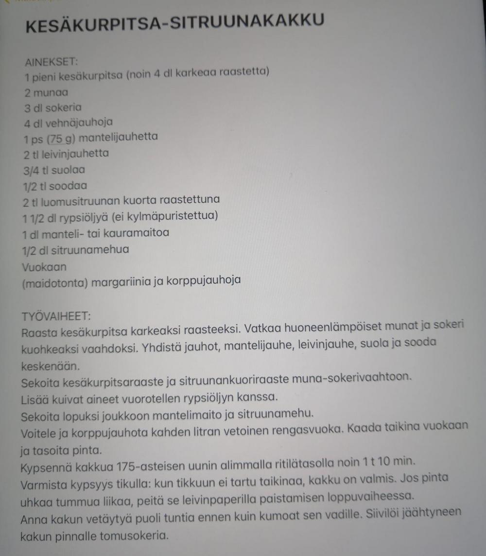Syksyisen piirakan pohja syntyi kuivahtaneista leipä/kakku muruista joihin lisättiin 2 rkl vettä ja 1 dl hiivaleipäjauhoja ja 1 dl kaurajuomaa. Täytteeksi kermaviiliä, 2 kanamunaa, raastettuna 2 porkkanaa, persimoni ja parmesaania. Mausteeksi sitruunapippuria. Taikina paineltiin tiukasti vuokaan, päälle raasteet ja sitten kermaviili munaseos, jossa mausteena sitruunapippuri. Paisto 200 C 25-35 min.